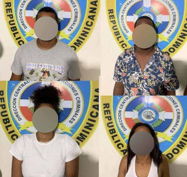 Los detenidos son Pedro Antonio Santana Solís, alias “Moreno”; Samilee Altagracia Bautista Cuevas; Sandra y/o “Samy La Maestra” Katherin Riveras; y Windy Miguel Jáquez, alias “Chino”, residentes en Santo Domingo, San Cristóbal y Santiago.